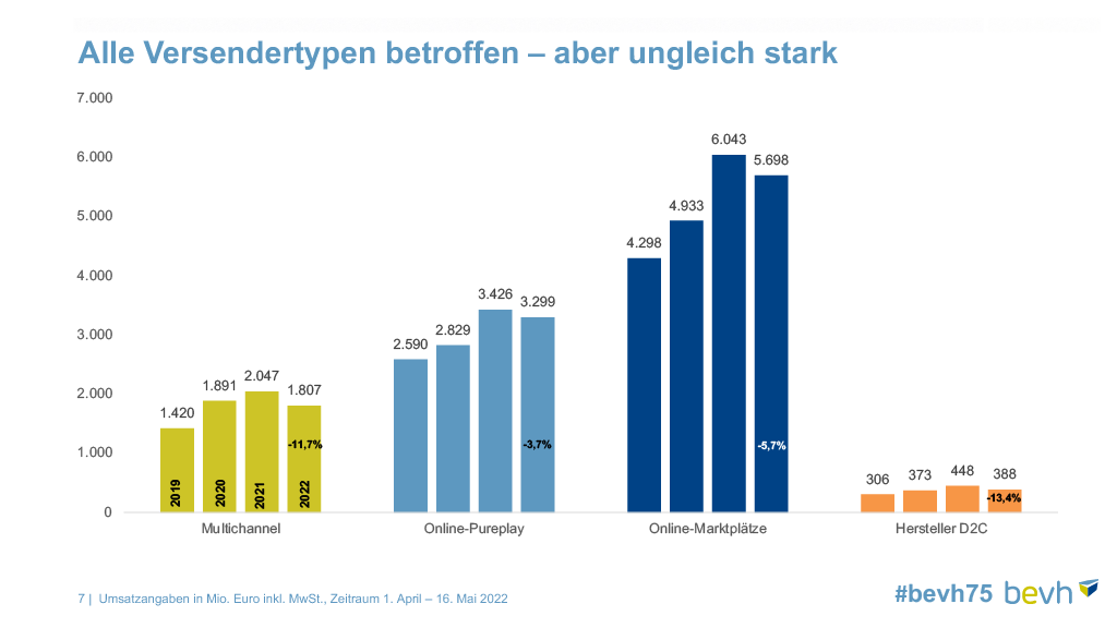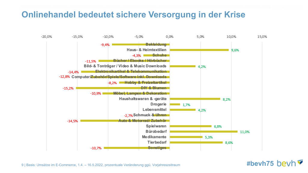Despite these differences, the overall picture is negative. According to figures from the bevh German e-commerce shrank by 6.7% between the beginning of April and mid-May 2022 compared to the same period last year. With one exception: everyday goods such as groceries recorded an increase of 4.1%.
